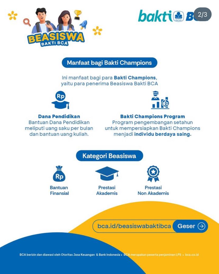Beasiswa Bakti BCA memberikan dukungan finansial sekaligus berbagai program pengembangan diri, seperti pelatihan soft skills dan networking dengan profesional dari berbagai bidang. Ini adalah peluang yang sangat baik bagi mahasiswa yang ingin memperkuat keterampilan manajemen dan membangun jejaring profesional.