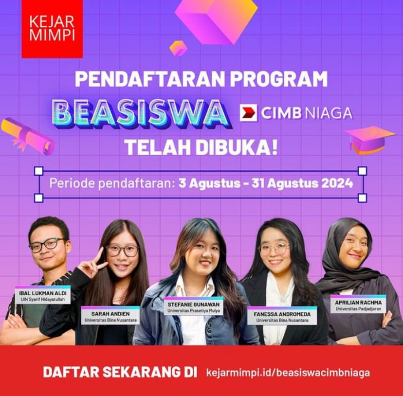 Beasiswa CIMB Niaga memberikan bantuan biaya pendidikan dan kesempatan magang di CIMB Niaga. Program ini sangat cocok bagi mahasiswa yang tertarik mengembangkan karier di sektor perbankan dan keuangan, memberikan pengalaman langsung di industri yang kompetitif.