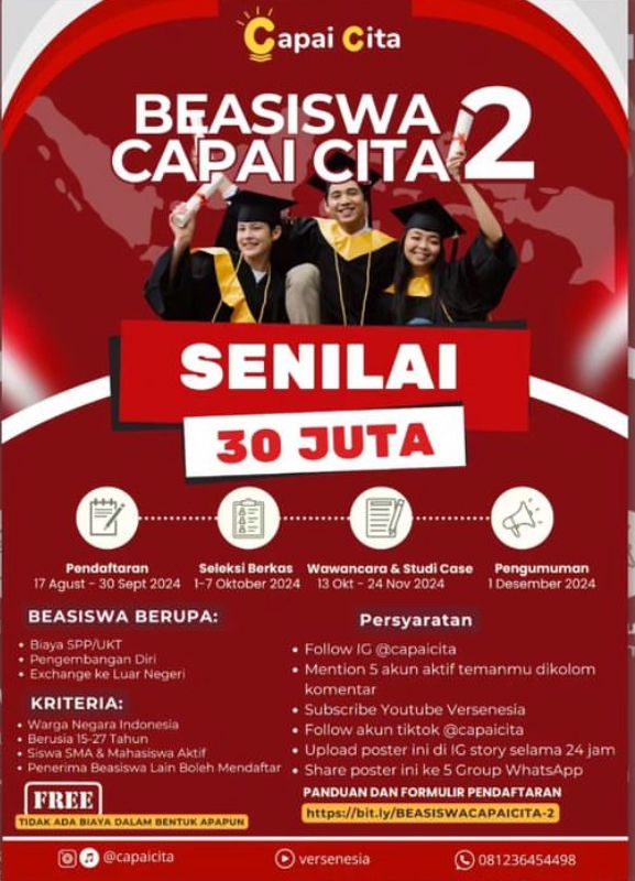 Beasiswa Capai Cita 2 menawarkan bantuan pendidikan bagi mahasiswa yang memiliki semangat tinggi dalam meraih cita-cita. Program ini juga memberikan pelatihan dan workshop untuk membantu penerima beasiswa mengembangkan potensi diri secara maksimal.