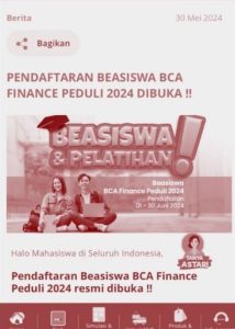 Beasiswa BCA Finance Peduli 2024 dirancang untuk mahasiswa yang berprestasi namun memiliki keterbatasan ekonomi. Program ini tidak hanya memberikan bantuan biaya, tetapi juga mendukung pengembangan karakter dan kepedulian sosial, sehingga penerima beasiswa diharapkan bisa memberikan kontribusi positif bagi masyarakat.